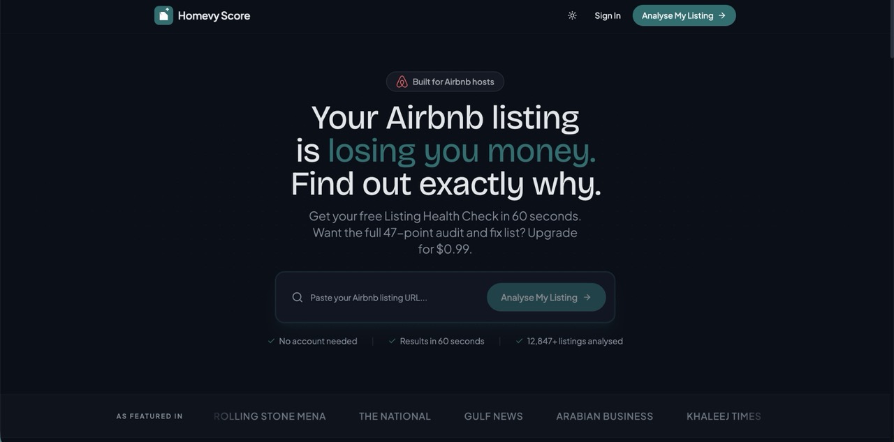 That tool is called the Homevy Score – an Airbnb listing audit tool built inside our property management company, used internally at first, and now opened up to Airbnb hosts in Dubai for only $0.99, less than a cup of coffee.